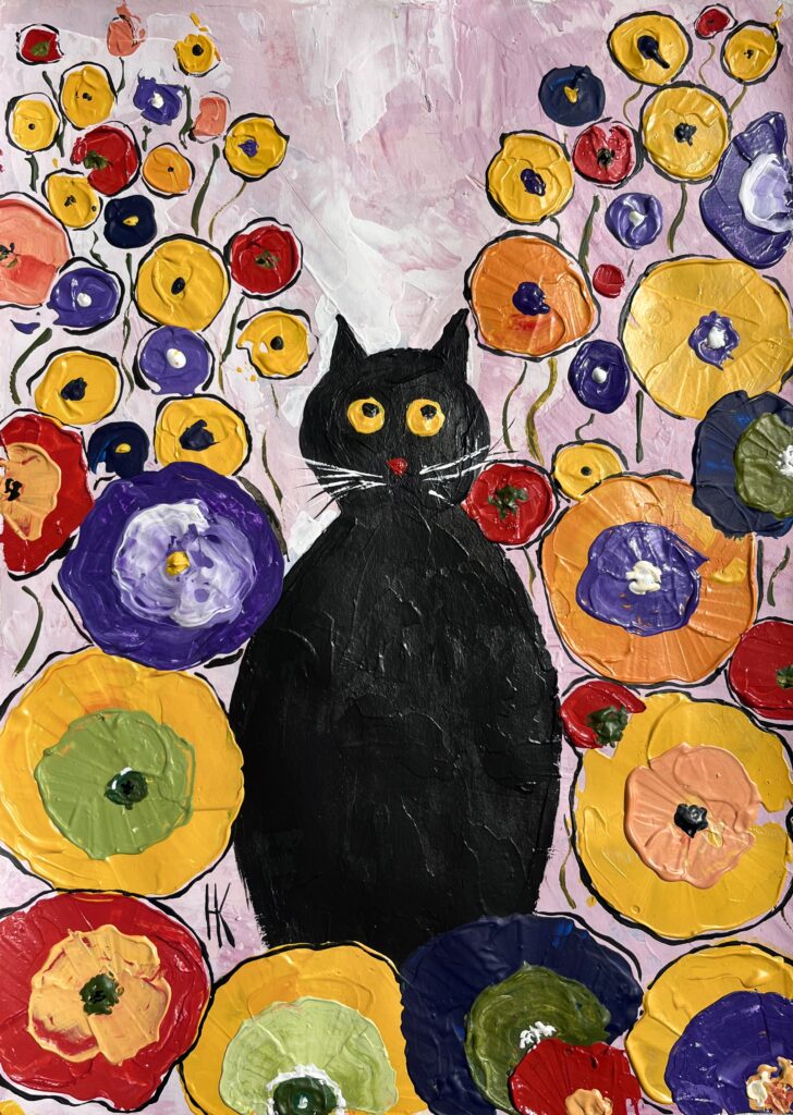 I have a cat called Mari. She is so funny and gives me a lot of inspiration everyday. So I am creating many Cat Paintings. My cat Mari always makes a company for me in painting or another home life. You are welcome to our world. Here you can see my new Black Cat Painting.