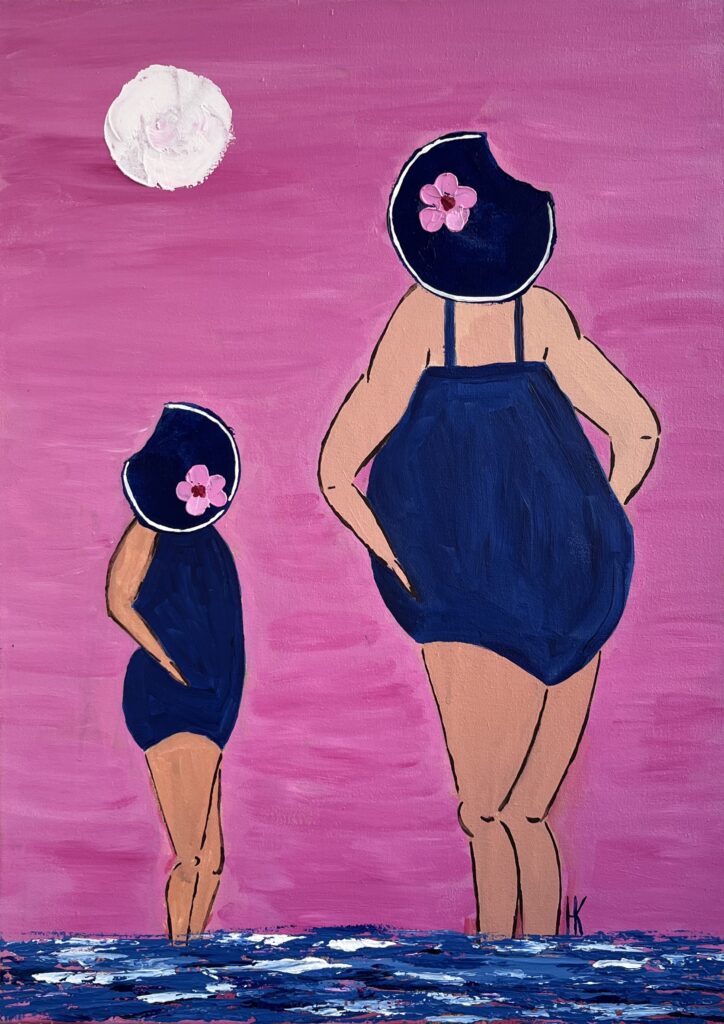 In this artwork, Halyna Kirichenko portrays a tender moment between a grandmother and her granddaughter spending a day by the sea. Dressed alike in blue swimsuits and hats with small flowers, they seem to reflect one another — two generations connected by affection and shared experience. The simplicity of their posture conveys quiet intimacy and mutual understanding…as if life itself has stopped for a moment to convey something important and tender from the older to the younger.