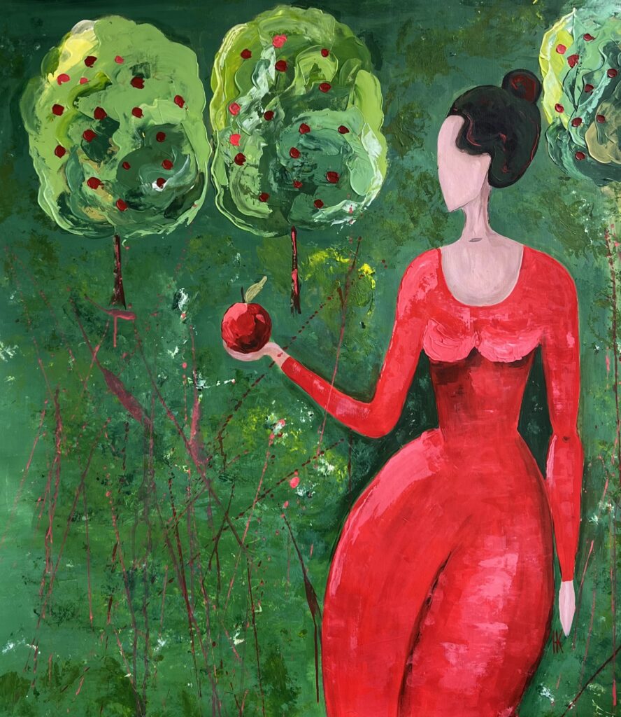 Surrounded by lush green trees full of fruit, she inhabits a symbolic space where temptation, intuition, doubt, and inner truth coexist. The contrast between her radiant red dress and the deep green landscape heightens the tension between action and contemplation. In this moment of stillness, she listens for the quiet voice of her own soul — the voice we often hear only in solitude, when no external advice can guide us.