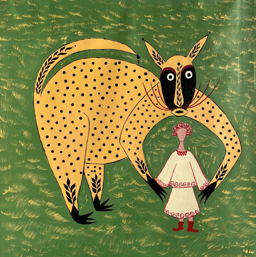 In this painting, Halyna explores one of the essential stages of human life — the moment of inner encounter with one’s own strength, fears, and intuition. The mysterious spotted creature, both guardian and reflection, represents the instinctive, untamed part of the self that accompanies us through transformation. The girl in traditional dress stands calmly within its protective embrace, symbolizing the dialogue between innocence and experience, between what is visible and what is deeply felt.