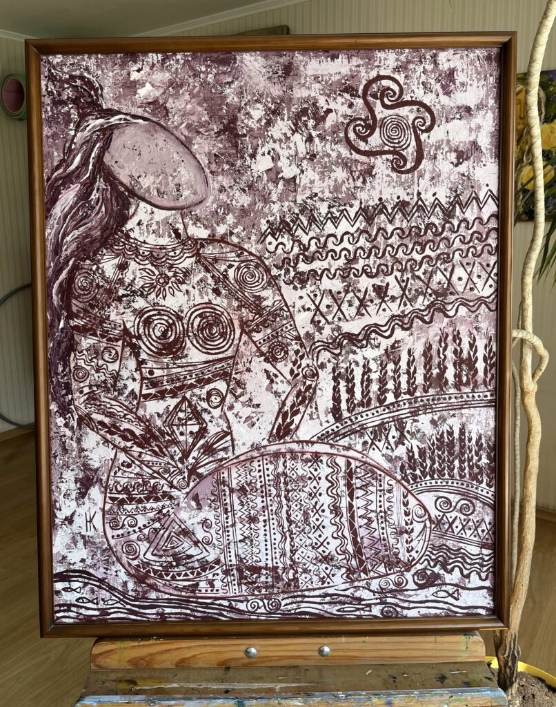 Trypillian tribal woman original oil painting on canvas. 19 x 24 inches. Artwork is availlable for sale.